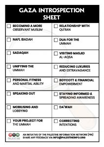 As the world approached the one year mark of the Israeli genocidal campaign on Gaza, and as advocates for justice hailed one year of determined Palestinian resistance, the Palestine Information Network (PIN) released a Gaza Introspection checklist and guide to refocus solidarity efforts and responses at this time of heightened awareness.